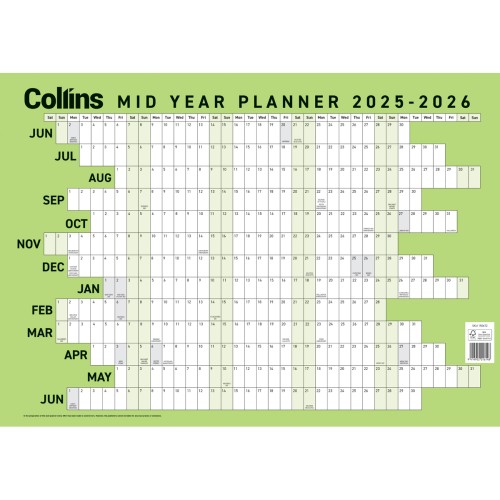 Organise your year with this Collins A2 Mid Year Green Planner, dated 1 June 2025 to 30 June 2026. The A2 landscape planner features matt finish and double-sided design with two calendar format options so you can choose the one that works best for you. Handy 13-month layout.