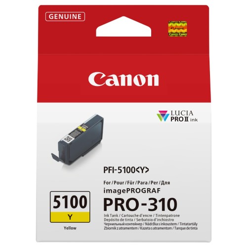The Canon PFI-5100Y Yellow Ink Cartridge, featuring 14.4ml of Lucia Pro II Ink, is designed to deliver exceptional colour accuracy and vibrancy for professional-grade printing.