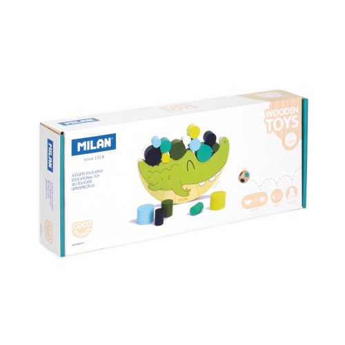 Milan Coco Balance educational wooden toy. The aim of the game is to stack the colorful cylinders over the crocodile base. Includes a crocodile shaped balance figure, a dice and 18 cylindric pieces. From 1 to 6 players. It encourages the observation, balance and concentration development. Recommended from 3 years old.