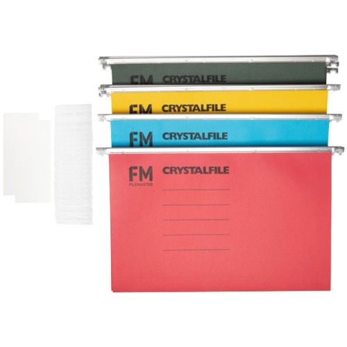 These assorted coloured FM Crystalfile Suspension Files are a great way to organise your documents, letting you go a step further by colour coding your filing system. Featuring a nylon glide that allows the folders to slide effortlessly in your storage unit. The files measure 406x240mm (wxh) and come complete with tabs and title strips.