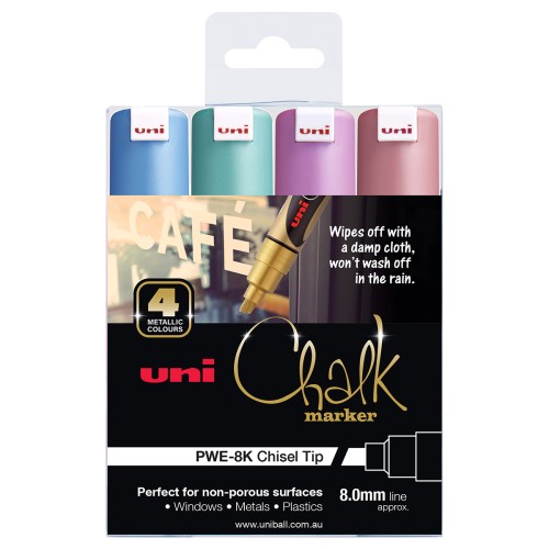 Uni Chalk Marker 8.0mm Bold Chisel Tip 4 Pack Metallic PWE-8K