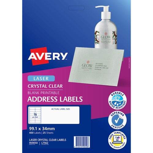 For a perfect transparent effect, Avery Crystal Clear labels virtually disappear when applied to white and coloured surfaces, giving a professional printed-on look. Ideal for envelopes, letters and product labelling, these high gloss clear labels look incredible on white and coloured backgrounds, glass, plastic and metal. Incredibly durable (oil, dirt, splash and tear proof) and ideal for addressing on wedding invitations, coloured envelopes and for corporate events.
