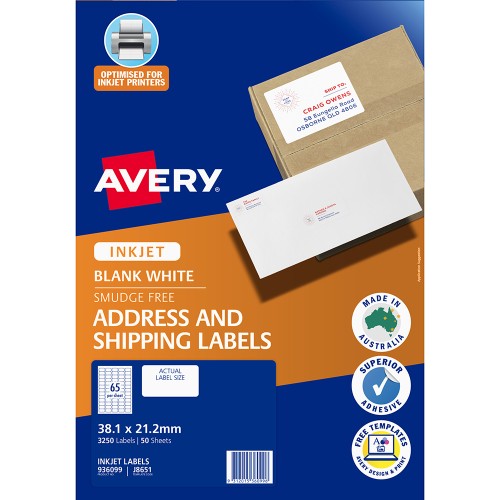 Print your address labels for letters and envelopes, quickly and easily using your inkjet printer. Avery address labels offer our Sure Feed® feature which delivers a more reliable feed through your printer by preventing jams and misalignments. These labels also come with our special Smudge Free promise, ensuring smooth print results with your inkjet printer so you can confidently apply the label straight onto your envelopes without any smudge marks.