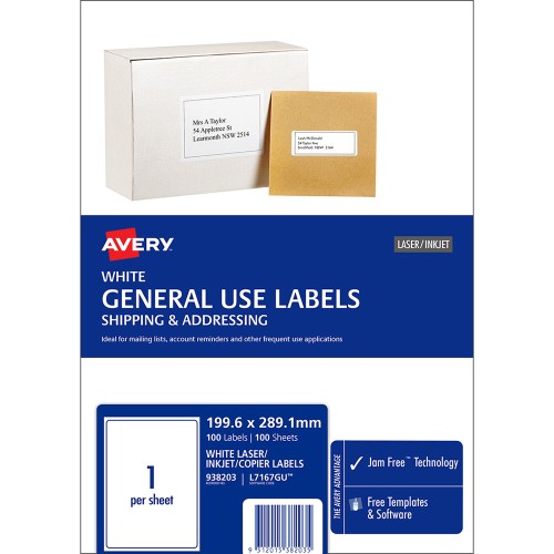 Avery Label L7167 General Use A4 1up 100 Sheets 199x289mm