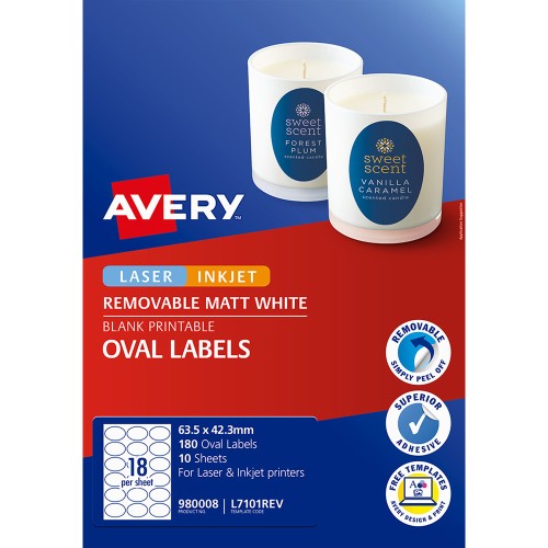 These white removable labels come in an oval shape of 63.5 x 42.3mm in size with 18 labels per sheet. With 10 sheets per pack, that’s 180 labels in total and can be printed using your laser or inkjet printer. They're great for gift items where pricing is removed before gift wrapping and especially for branding candles, glassware and jars.