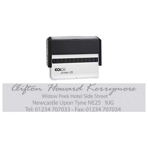 The COLOP Printer 25 is an elongated, handy model that is very popular. With an imprint area of 75x15 mm, this self-inking stamp is ideal as a return address on letters, in the corner of documents or even on large labels. Its compact size allows flexible use in various applications. The ink pad of the COLOP Printer 25 can be selected in one of four colours: Blue, Red, Black or Green. This gives you the option of matching the colour of your stamp impressions to your needs and leaving clear, legible impressions. The COLOP Printer 25 offers enough space for up to four lines of text. This guarantees that your information is clearly legible without the font size becoming too small. For longer text, it may be necessary to upgrade to one of the many larger models to ensure legibility and production quality. Thanks to its ergonomic design, the COLOP Printer 25 is easy to hold and ensures a comfortable and efficient stamping process. If you are looking for a practical and reliable stamp for everyday use, the COLOP Printer 25 is the perfect choice. This stamp takes spare pad series E/45.