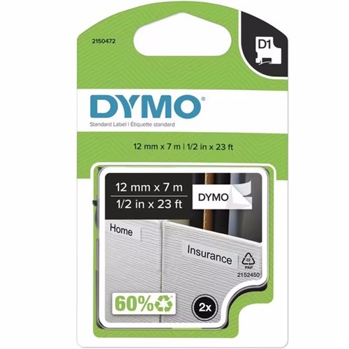 2-pack Dymo 2150472 D1 Black on White Label 12mm x 7m - Genuine