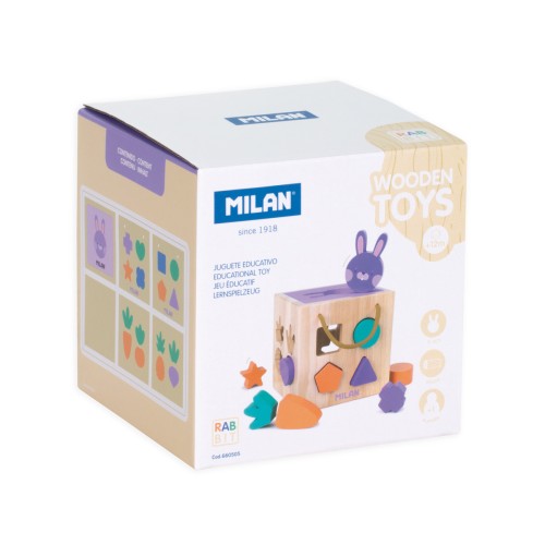Milan Rabbit Cube wooden educational toy with 17 geometric, rounded pieces and a cube with matching holes and a cover for emptying it. It encourages the fine motor skills, logic and visual coordination development. Recommended from 12 months.